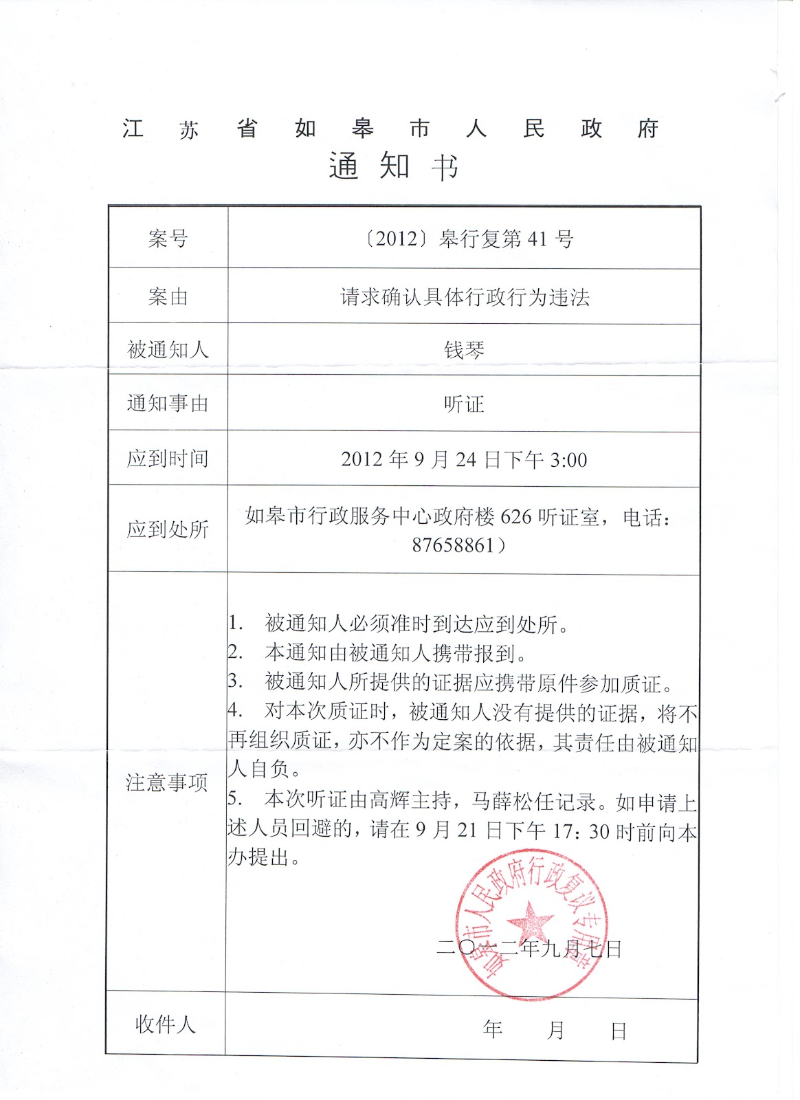 (维权网信息员张宁宁报道)江苏省如皋市人民政府定于2012年9月24日下午3点,在如皋市行政服务中心政府楼626听证室公开进行听证会,听取钱琴和如城镇人民政府的意见。本案争议焦为:是否存在城管执法侵权。