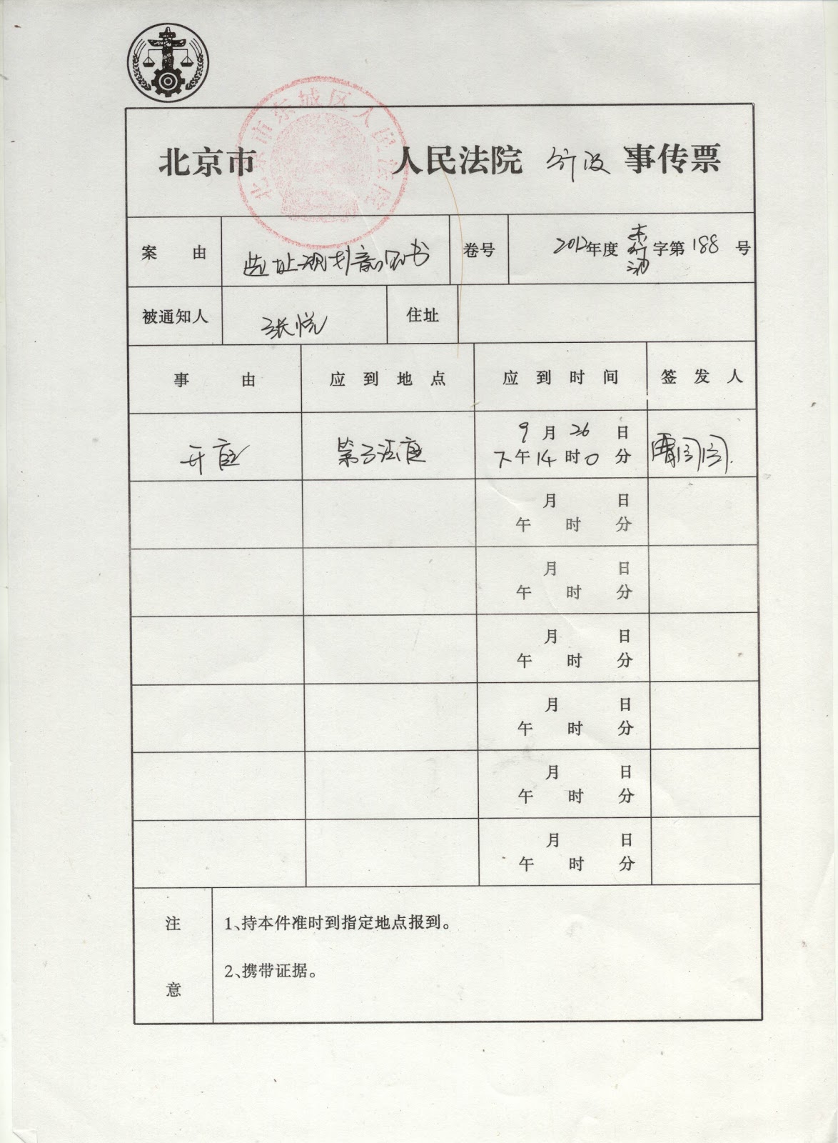 (维权网信息员张宁宁报道)北京市居民张悦起诉北京规划委员会一案,西城区人民法院定于2012年9月26日下午2点在第三法庭公开审理。