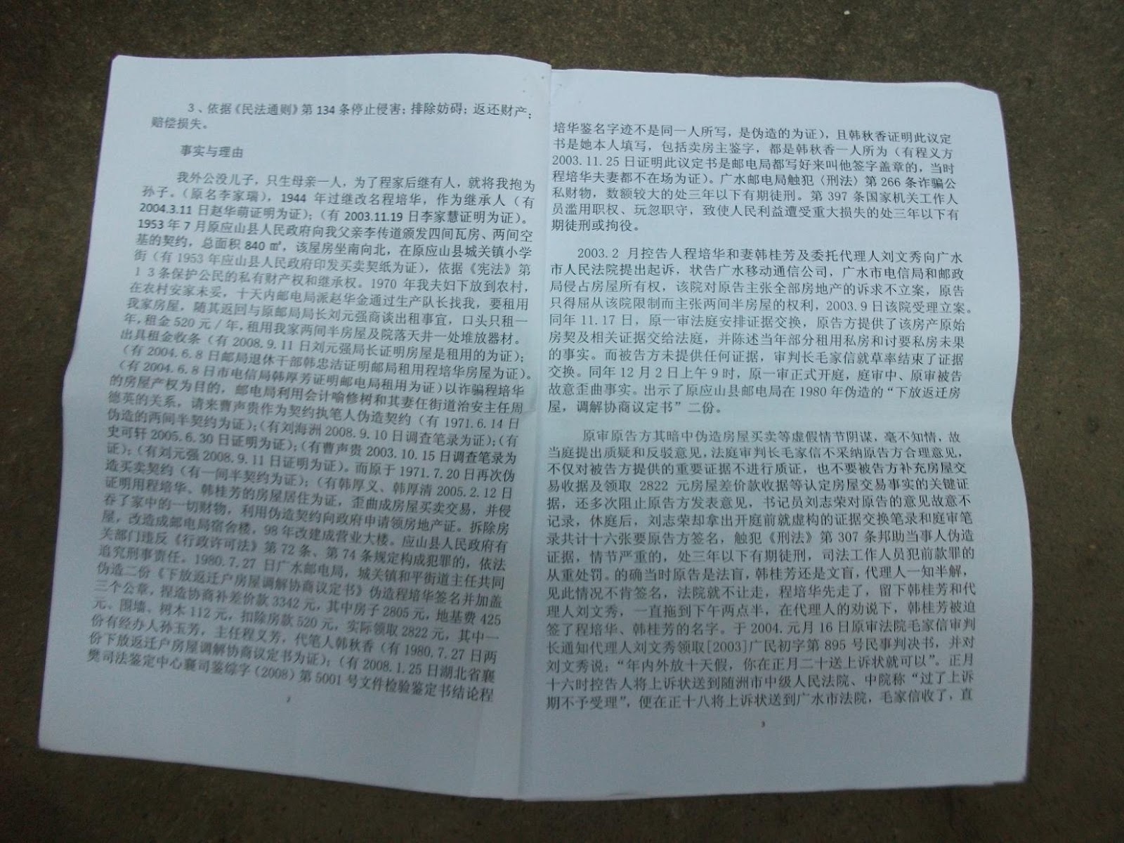 案发经过:原居住在应山县(现改为广水市)城关镇小学街的访民韩桂芳、程培华夫妇,拥有住房840平方米及两间宅基地,1970年韩桂芳同丈夫程培华被下放到农村,随后与其在县城住房紧邻的电信局派人下乡联系,要求租用她家县城住房,并随后返回县城与电信局局长刘元强见面商谈,口头约定电信局租用住房两间半,院落和天井供电信局堆放器材使用,年租金520元。之后,电信局又将秦大贵、吴孝芳夫妇强占韩桂芳的住房一同拆除建成楼房。当韩桂芳、程培华夫妇发现财产被侵占后,不断向电信局讨要无果,被迫于2003年向广水市法院起诉。2003年12月31日,广水市法院由审判长毛家信、审判员余登明、程开镜、书记员刘志荣参入审判,以“原告程培华、韩桂芳诉三被告侵占其房屋所有权、其依据以1953年7月原应山县人民政府颁发的房地产契约为凭,证明其有祖业房屋四间、二间空基,本院予以认可,1971年6月,原告程培华将其两间半房屋卖给了原应山县电信局,电信局于当年将买其的房屋和其它房屋全部拆除、并改建成了住宿楼。1978年原告程培华、韩桂芳全家从农村返城,1980年7月,与原应山县邮电局在有关组织调解下,签订了‘房屋调解协商议定书’,对原告程培华1971年6月所卖的二间半瓦房作了差价补偿,并对其原有的附着物全部作了补偿,原告程培华领取了补偿。当年,原告程培华、韩桂芳应当知道其一间半房屋拆除、其权利被侵犯、而没有举张权利。且二原告程培华、韩桂芳与三被告讼争的房屋几经拆建,变成了如今的综合大楼。二原告现在再提出三被告(移动公司、电信局、邮政局)侵权,要求返还一间门面屋,赔偿损失359280元,显然与理与法不符。《中华人民共和国民法通则》第37条‘诉讼时效期间从知道或者应当知道当权利被侵害时起计算。但是从权利被侵害之日起超过二十年的,人民法院不予保护’ 的规定,原告程培华、韩桂芳的起诉已超过诉讼时效,对原告的诉讼请求,本院不予支持。”判决:“驳回程培华、韩桂芳的诉讼请求。案件受理费5000元,由程培华、韩桂芳承担。”