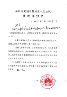 (维权网信息员张宁宁报道)9月21日,安徽省芜湖市镜湖区法院向朱安武送达(2012)镜行初字第25号《受理通知书》,告知其诉芜湖市镜湖区住房和城乡建设委员会、第三人芜湖市镜湖区城际铁路征迁工作办公室一案,已决定受理。朱安武的行政诉讼请求:依法确认被告芜湖市镜湖区建设委员会作出的镜房拆延字(2010)第102号拆迁延期公告违法。