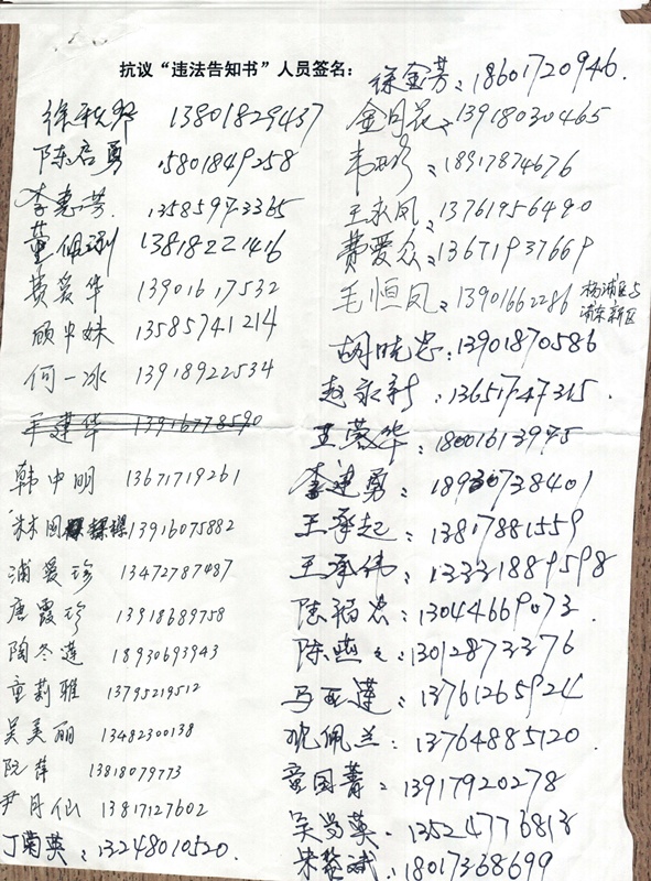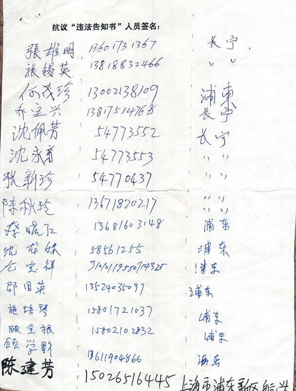 (维权网信息员孙小芸报道)上海市维权人士毛恒凤、陈启勇、顾中妹、丁菊英、陈建芳等数十人签名,抗议公安机关对公民下达《告知书》。