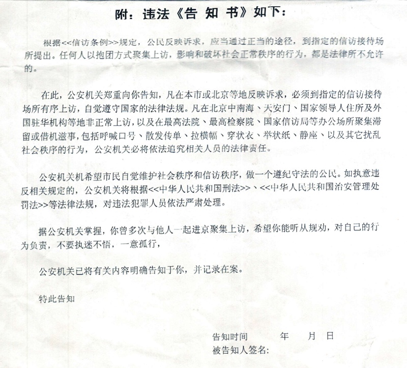 为此,上海市的上访维权人士再一次集体向公安部控告:上海政府及公安机关的行政不作为、乱作为的违法行为,并对向维权人士下达“告知书”提出强烈抗议。