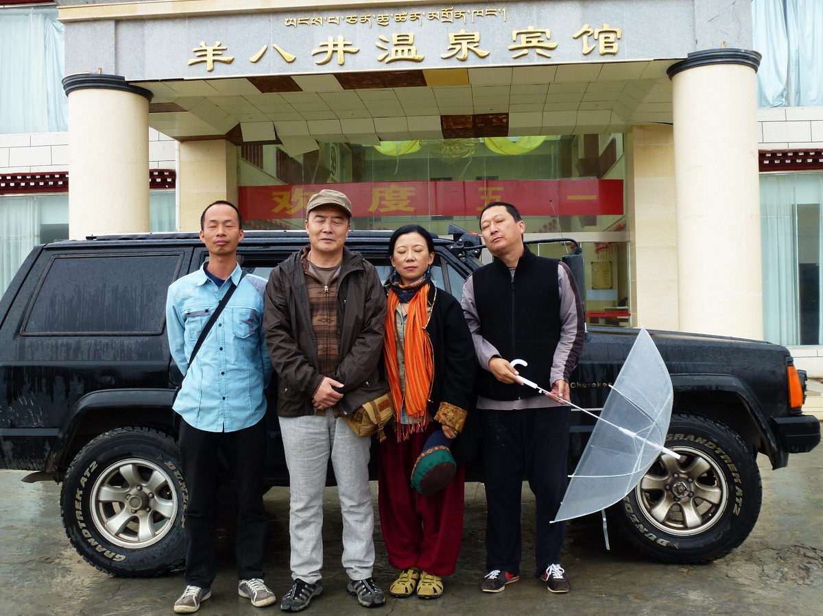 | 之后,我们又被拦在进入拉萨之前的羊八井检查站,当晚很晚不得不留宿很贵的羊八井温泉宾馆。一路上,我们有一个以合影的方式“闭眼不看西藏”的行为艺术。照片上,我们(朱日坤、王力雄、我、王我)都闭上了眼睛。。 |