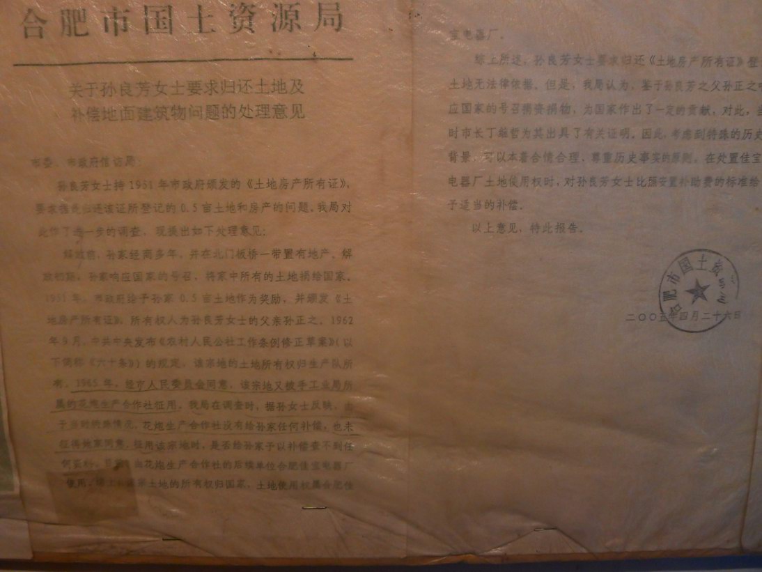 就此短信 本网信息员采访了 孙良芳 女士,她称自己父亲于1951年向合肥市政府捐献了自家大部分家产——三十多亩土地和巨额资金,当时合肥市政府奖励了0.5亩土地给其家做宅基地,并颁发了《土地房产所有证》,上面盖有市政府的大印和市长的签名。可是,在政治动乱的年代,土地房产被政府毫无道理的夺走,改革开放之时, 孙良芳 女士继承父志,要求政府返还土地房产,合肥市国土资源局在回复中共合肥市委、合肥市政府信访局的《关 于孙良芳 女士要求归还土地及补偿地面建筑物问题的处理意见》中建议“本着合情合理,尊重历史事实的原则,在处置佳宝电器厂土地使用权时,对 孙良芳 女士比照安置补助费的标准给予适当的补偿。”而合肥市政府信访局却决定不予补偿,并在12月27日作出的合访查字(2007)03号《孙良芳要求政府归还0.5亩土地信访事项复查意见》, 孙良芳 女士不服向安徽省政府提出复核申请,安徽省政府于2008年4月13日作出皖信核(2008)7号《关于孙良芳同志信访事项的复核意见》,维持了合肥市政府的复查意见。 孙良芳 女士不服,到法院起诉请求法院依法撤销上述信访复查意见和信访复核意见。