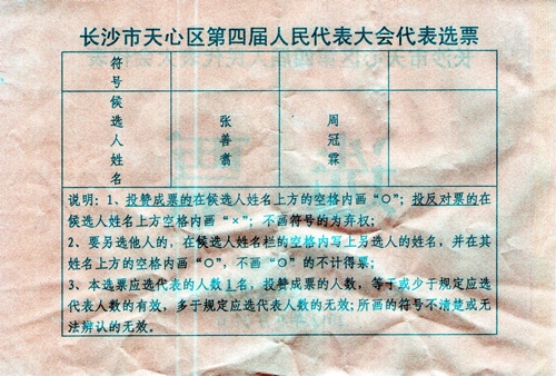 (维权网信息员姚立法报道)裕南街道办事处是天心区政府的派出机构。天心区第30选区只有两位由天心区选举委员会非法确定的正式代表候选人张善翥和周冠霖。据不少第30选区的选民讲,裕南街道办事处主任张善翥是内定的要确保“选”上天心区第四届人大代表的、而裕南街道办事处杏花园居委会-般工作人员周冠霖只是一个“陪选”者。