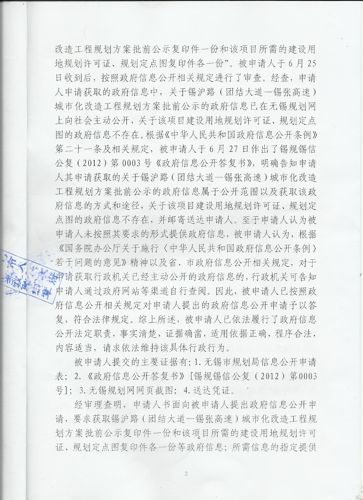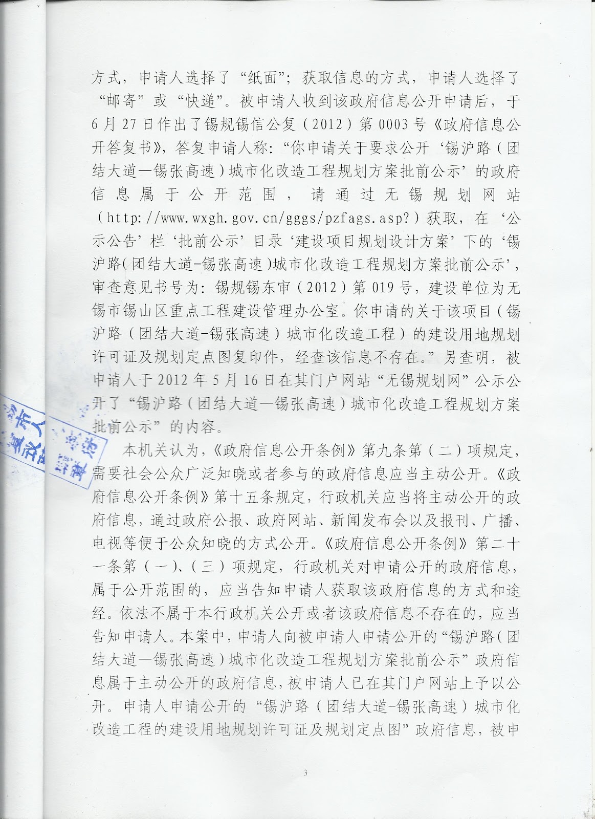 王建芬认为,无锡市规划局的行为,违反了《中华人民共和国政府信息公开条例》第二十六条规定,即:“行政机关依申请公开政府信息,应当按照申请人要求的形式予以提供;无法按照申请人要求的形式提供的,可以通过安排申请人查阅相关资料、提供复制件或者其他适当形式提供”由此可见,市规划局作为行政机关“应当按照申请人(原告)要求的形式予以提供”,即使“无法按照申请人要求的形式提供的,可以通过安排申请人查阅相关资料、提供复制件”况且,本案不存在“无法按照申请人要求的形式提供的”问题。