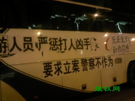 (维权网信息员李军报道) 10月2日 ,长沙上访维权者刘华等17人在北京旅游,被北京公安以查身份证为由带离北京 东方 君悦大酒店,随后交给黑保安,17人被强拖上京B09705的大巴,遣送回长沙,期间多人被殴打,17人名单:李香,吴莎,李仲瑜,黄美珍,眭建平,段静玲,肖利红,黄振湘,穆明德,唐国玉,罗林,曾才温,江灿,骆凤球,刘桂华,丁文茵,刘华。