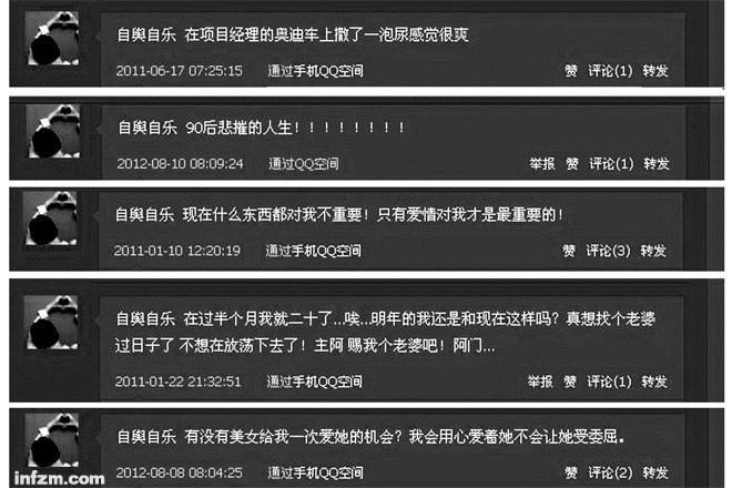 在QQ空间中,蔡洋孤独地诉说对爱情的渴望,时不时哀叹自己“悲摧的人生”。 (何籽/图)