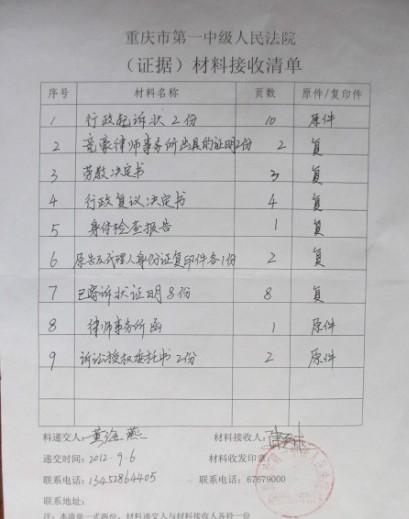 9月6日,作为黄成城的委托代理人,浦志强律师向重庆第一中级法院提交了起诉材料,起诉重庆市劳教委。法院接受了材料,并开出了收据。