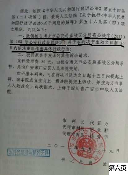 (维权网信息员李娜报道) 9月29日四川南充网友李友谋(13990828332),从广安市广安区法院拿到了他的行政诉讼一审判决书,法院确认了南充公安局作出的行政处罚决定违法,同时撤销该决定,但法院却又认定李友谋的转帖行为违法,要求南充公安机关重新作出具体的行政行为,由此导致李友谋不服,向广安市中级人民法院上诉,现在中级法院已经依法立案。