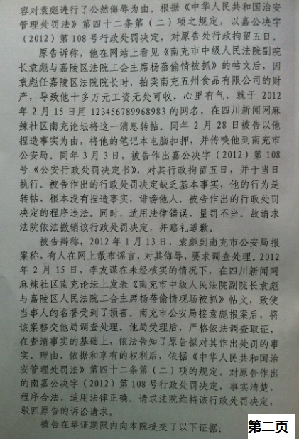 据李友谋介绍说:2012年2月15日10时13分复制转发《南充市中级人民法院副院长袁彪与嘉陵区法院公会主席杨蓓偷情现场被抓》一文至麻辣社区南充论坛上。当日下午2点就被南充市公安局网警支队违法传唤(没有传唤证,没有当地公安机关的协助),同时转发的帖文被删除(当时没有多少人点击,没有回复)。李友谋认为南充市公安局网警支队是违法传唤,就发了《向广大网友求助,希望广大网友关注》的帖子在麻辣社区南充论坛上,南充市公安局网警支队为了报复李友谋,2月28日就叫嘉陵区公安分局网警大队传唤了李友谋,3月3日李友谋被处拘留5日的处罚。