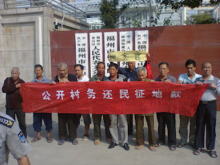 (维权网信息员信天顺报道)前天(10月10日)上午,十几位福州市仓山区盖山镇屿宅村失地农民代表,在通过正常信访无法解决,政府不管,检察院不受理的情况下,被逼集体到仓山区政府前“揪贪官”!联名要把侵吞他们数千万元征地款的贪官揪出来绳之以法。