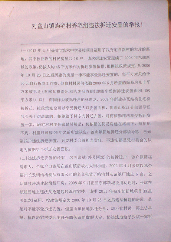 三年前,福州市修建林浦路,强征强拆屿宅村土地,整个过程都是暗箱操作。数千万元征地拆迁款被强取豪夺不知去向,可随着时间的推移,失地农民又发现拆迁办和屿宅村官员相互勾结,滥用职权明目张胆采取弄虚作假手段,套取国家征地拆迁补偿安置房。