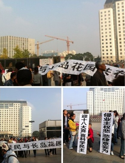 10月15日上午,苏州葑门长岛花园小区的居民去苏州市政府拉横幅维权,抵制将长岛花园小区的配套绿地开发为文体公园,遭警察驱离,现场哭嚎一片,并有人受伤。