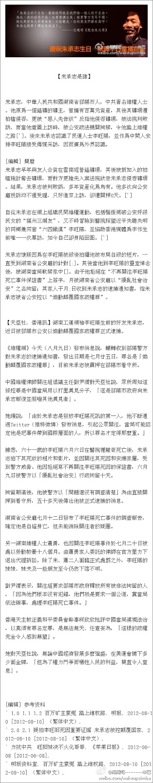 (维权网信息员赵小明报道)十月十八日是入狱132天的著名维权人士朱承志的生日,大陆网民以祝福朱承志生日的方式表达对当局关押维权人士的抗议。朱承志先生因关注湖南民运人士李旺阳离奇死亡案,遭当局报复逮捕,控罪“煽动颠覆”。此举激起国人的愤怒。朱承志失去自由以来,对他的声援和呼吁不绝于耳。维权律师刘晓原日前曾呼吁为朱承志祝福生日来表达抗议。