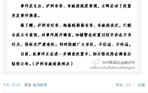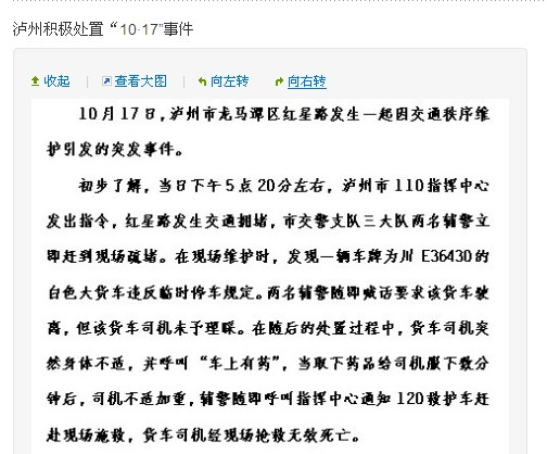 四川新闻网|泸州官方:司机身体不适致死 2012年10月17日 10月17日,泸州市龙马潭区红星路发生一起因交通秩序维护引发的突发事件。今日5点05分,泸州市政府新闻办公室官方微博发布《泸州积极处置“10·17”事件》,回应称货车司机因身体不适抢救无效死亡。 来源:四川新闻网 所在分类:参考消息,官媒视点标签:泸州,泸州交警打人事件 相关文章 【河蟹档案】泸州太伏警民冲突 自由微信|总有刁民被搞事,一起来唤自由歌!! 【敏感词库】泸州事件及廖亦武演讲相关及其他 2012-10-19 网曝泸州交警打人事件已用钱私了 元芳,”泸州事件”你怎么看?
