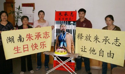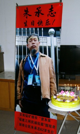 (维权网信息员赵小明报道)今天(2012年10月18日星期四)是身陷囹圄的朱承志先生62岁的生日。今天除了大批网民发帖、发微薄祝福朱承志外,数位福建维权人士在吴华英家为朱承志点燃了生日蜡烛,举起让朱承志自由的牌子。
