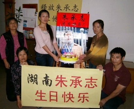 吴华英是当年“福建三网民诬陷案”的当事人之一,对于当年在她和范艳琼、游精佑落难时朱承志先生正气凛然、义薄云天的无私援助和呐喊记忆犹新。今天在她家,吴华英和他母亲(福清纪委爆炸冤案吴昌龙的妈妈),福清维权人士魏英、卓友贵,福州林兰英,一起为朱承志点燃生日蜡烛,共同呼吁朱承志先生早日获得自由。他们一起举起“湖南朱承志生日快乐”“释放朱承志,让他自由”的牌子表达他们对朱承志的关注。