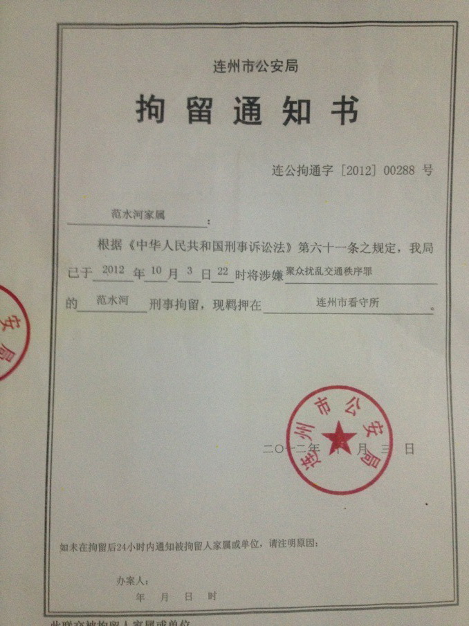 (维权网信息员张敏报道)广东连州市东陂镇东塘管理区大洞村维权村长范水河10月3日被当地警方以涉嫌“聚众扰乱社会秩序罪”刑事拘留,被关押于连州看守所中。