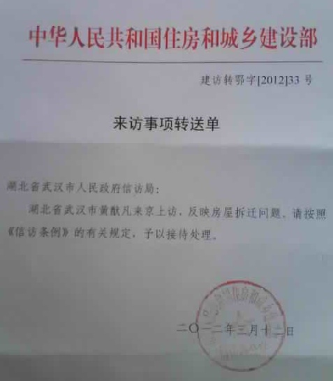 黄猷凡说:1982年我家是中国第一批暴力拆迁对象,武汉市房地管理局,在没有任何法律手续下就和“侵占者”合盟吞没了我家位于武汉市江岸区洞庭街33号私产门面房屋,政府也掠夺我家土地使用权非法将它“接管”用所谓【武房1990—176号文件】将此房盗窃是政府公房管理处,为此我家失去了唯一依托。《中华人民共和国宪法》——第13条规定:公民合法私有财产不受侵犯。《中华人民共和国物权法》——第66条规定:私有的合法财产受法律保护,禁止任何单位和个人侵占、哄抢、破坏。