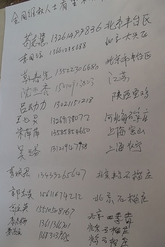 参会的上海市的上访维权者朱萍萍(13585854650)、吴玉芬(13121947738);陕西访民吕动力(13021151218);江苏访民沈立秀;河北访民王心灵;湖北访民周大珍等人也都从不同方面列举事实,强烈谴责腐败无能政府,贪官和黑恶势力相勾结,专欺负无权无势百姓,政府贪官贱卖完了国有和集体企业后,又强占百姓承包土地,大搞房产开发,捞取不法利益,不顾百姓生存。