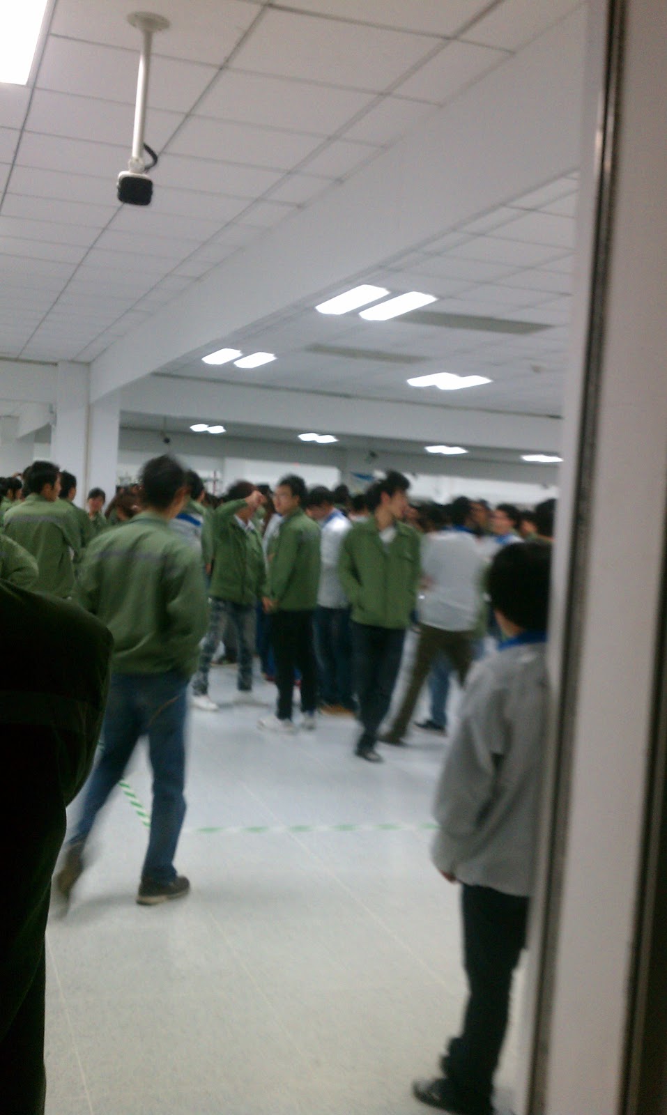 一位年纪稍大的工友对本网信息员说:10.21夜半就开始出现工人罢工的苗头,据说是周末加班公司视为调休(说白了就是不给加班费),他是从昆山调回成都来的,原本的几百快的回程奖也被取消.周末两天不准休息,无休止的压榨,待遇的低廉,终于引起员工的不满。