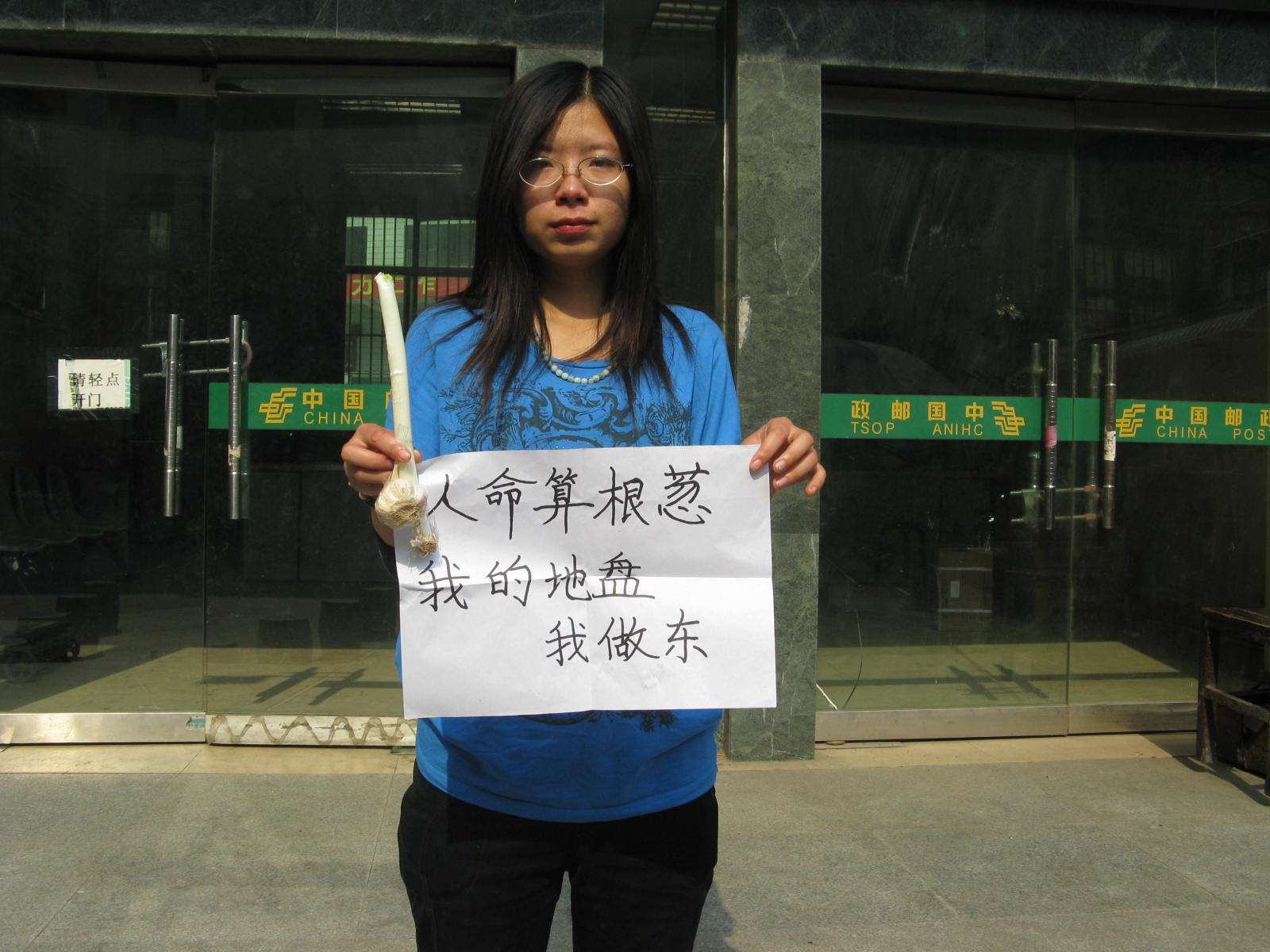 (维权网信息员夏侯东报道)10月20日,在信阳市火车站附近的邮政局,河南公民曹小东和陈莹给暴力执法的泸州交警支队三大队寄去了蒜和葱,劝警察莫要把“人命算根葱”,“我的地盘我做东”。