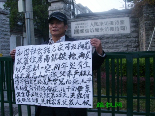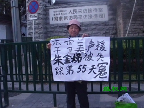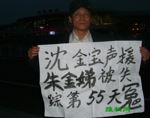 (维权网信息员孙小芸报道)10月23日,上海市的上访维权人士沈金宝从上海躲避截访者的层层阻扰到达北京,声援已经失踪55天的朱金娣。沈金宝与另一位上海的上访维权人士李雪美一起,为声援朱金娣被失踪第55天而到国家信访局、全国人大、中纪委,反映、投诉、举报,控告上海地方政府随意限制公民人身自由。