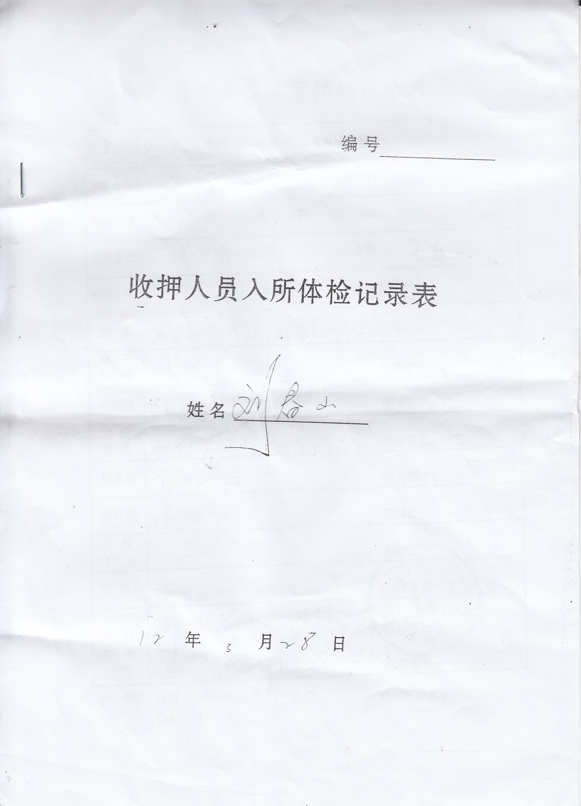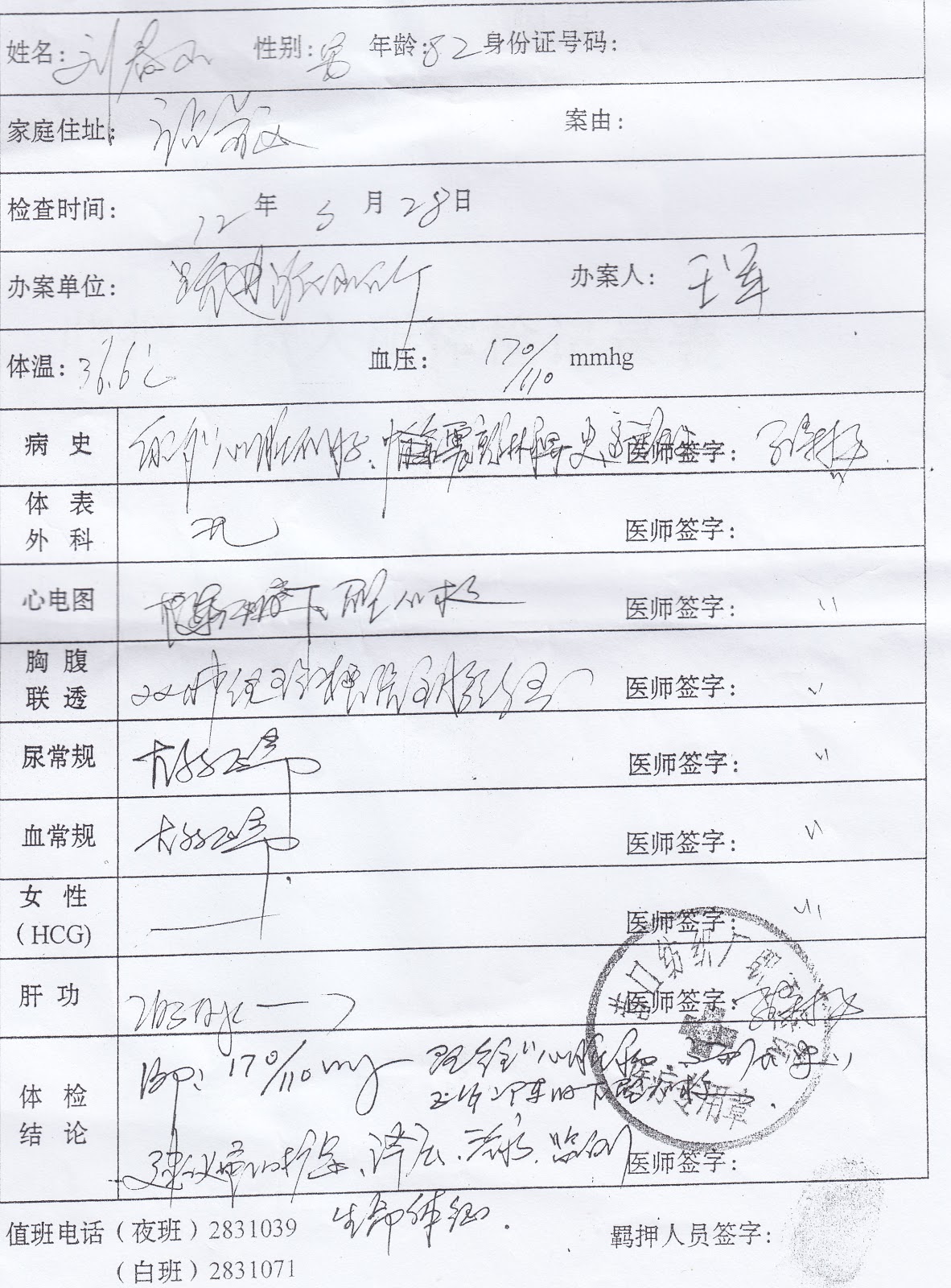 从刘春山向笔者提供的一份体检报告单显示:他被收监时血压高至170/110,同时还患有心脏病,但一样的被收监。