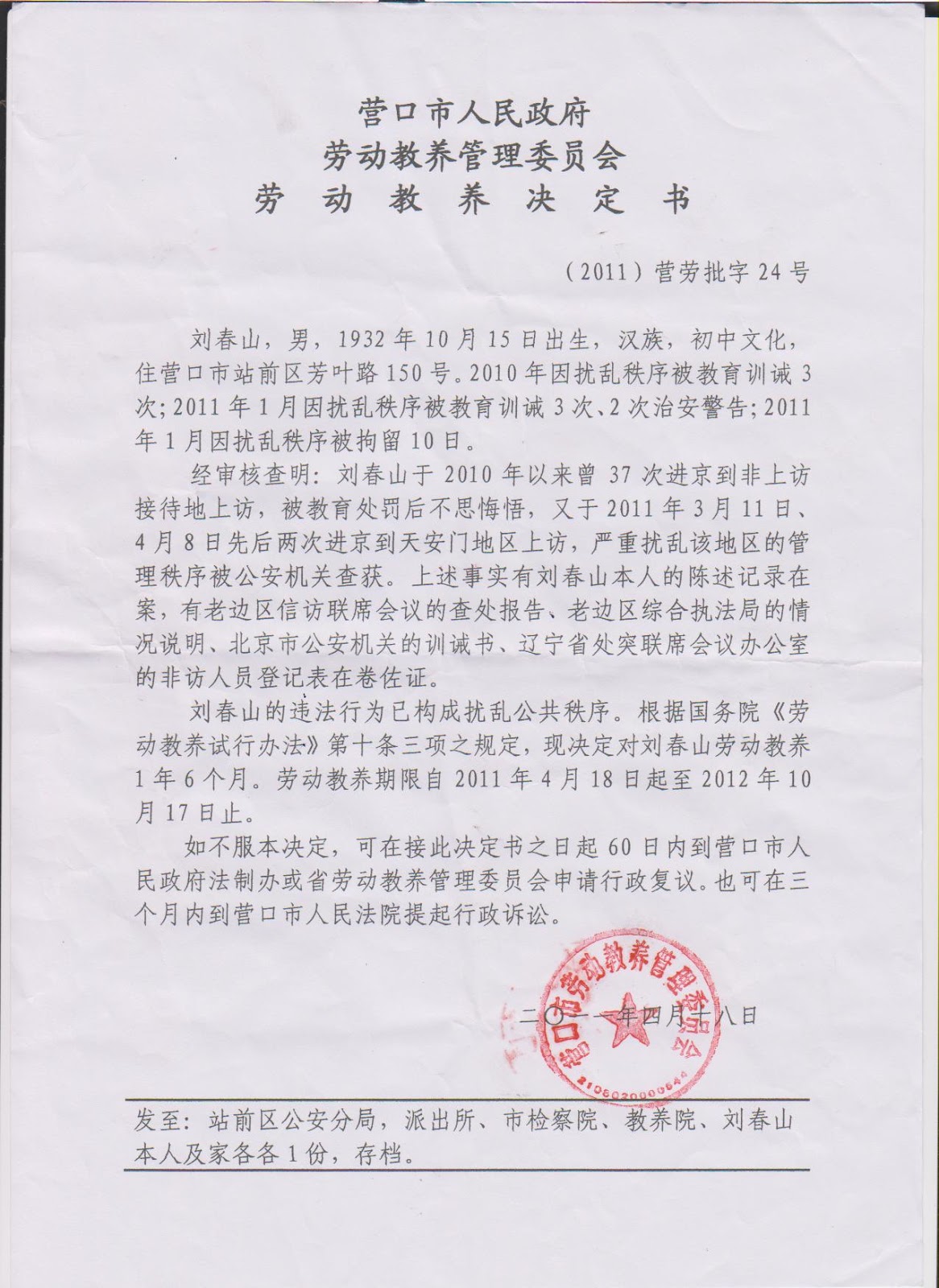 当地政府为掩盖官商勾结非法卖地的的事实,2011年4月18日以莫须有的罪名,编造事实,将81岁的老人,离休干部刘春山劳教1年半。