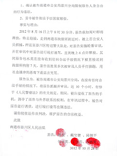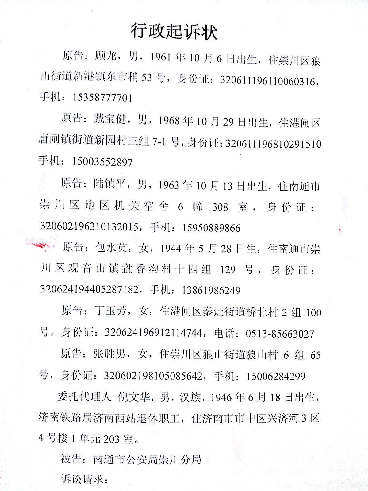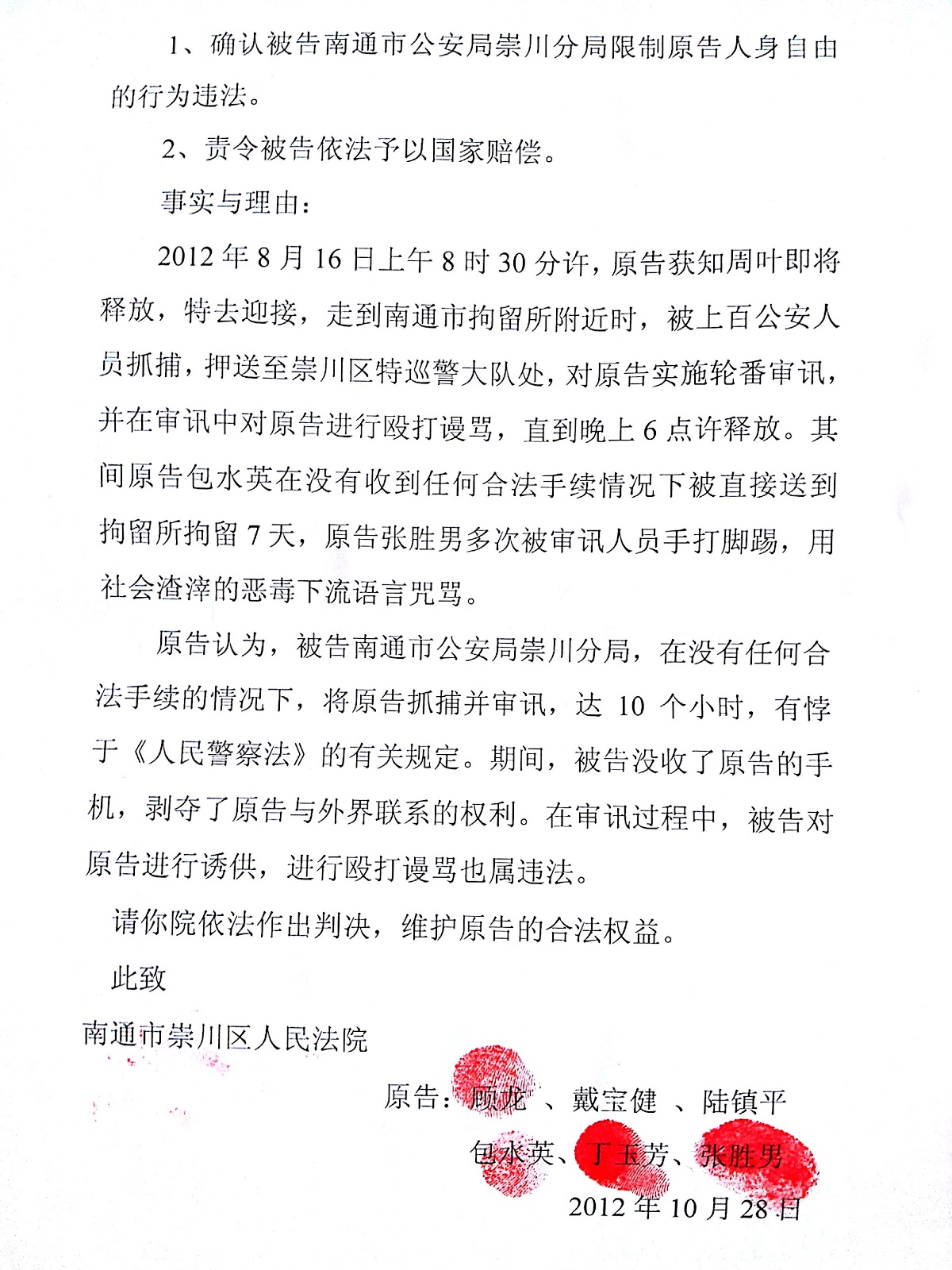 (维权网信息员张宁宁报道)2012年11月1日,戴宝健、陆镇平、顾龙、张胜男、丁玉芳和包水英等6位南通维权人士向法院提交行政诉讼状,并委托倪文华代理。该起诉状请求法院:1、确认被告南通市公安局崇川分局限制原告人身自由违法;2、责令被告依法予以国家赔偿。