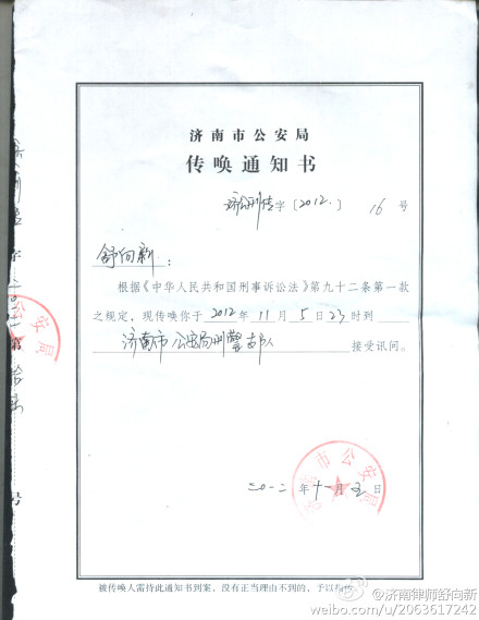 (维权网信息员赵小明报道)本网昨日(2012年11月6日)早晨报道《济南维权律师舒向新被警方从家中带走》后,引发舆论强烈关注。济南市公安局于2012年11月6日中午11点半与在其新浪微博“济南公安”中做出回应:“近一时期,济南市公安局不断接到受害单位及群众举报,经过周密细致侦查,大量证据证实:舒向新涉嫌犯敲诈勒索罪,济南市公安局刑警支队依法于2012年11月6日凌晨对其刑事传唤。现此案正在进一步侦查之中,相关调查结果将会及时公布。”