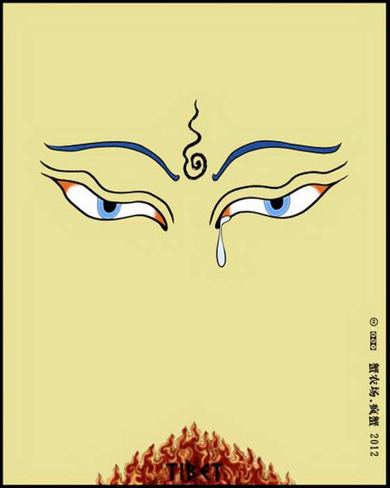 | 昨日,在安多热贡(今青海省黄南州同仁县多哇乡),18岁牧民鲁布嘉自焚,这是2009年以来第84位藏人自焚。图为漫画家疯蟹为自焚藏人作的画:《佛陀的泪》。 |