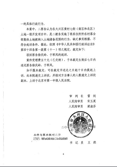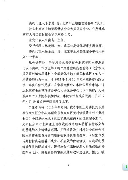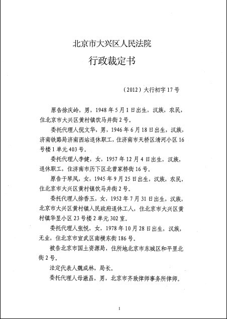 2010年8月间,北京市国土资源局委托北京市土地储备大兴区分中心实施征收储备,将徐庆岭夫妇使用的土地纳入土地储备范围,未举行听证会,也未征求行政相对人的意见,明显属于程序违法。2012年1月10日,徐庆岭夫妇向北京市大兴区人民法院提起行政诉讼,将北京市国土资源局和北京市土地储备大兴区分中心列为共同被告。该院于2012年11月24日向徐庆岭夫妇送达了(2012)大行初字17号行政裁定书,驳回徐庆岭夫妇的起诉。