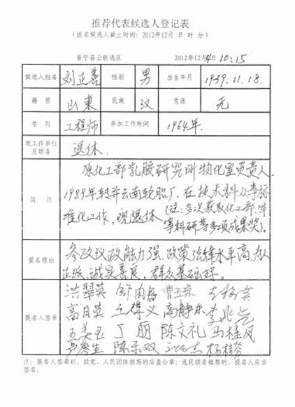 4号上午近10点钟,选民魏文英把王美玉、高静东等16位选民签名推荐的大专学历、工程师职称的刘正善为新一届区人大代表初步候选人的表送给段学恩,段说时间过了,推荐无效。