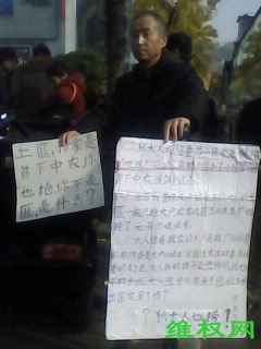 (维权网信息员雷鸣报道)12月5日星期三,是上海维权者向市委市人大市政府抗议的日子。上午八时,维权者陆续从上海各区县聚集到位于上海市人民大道200号的市委、市政府、人大市信访办,抗议当局掠夺公民合法的私有房屋、宅基地、自留地、承包地等财产,抗议司法不公、枉法判决,抗议医疗事故讨不到一个说法,抗议迫害反腐败维权人士,将依法维权者关进黑监狱、行政拘留、刑事拘留、逮捕、劳教、送精神病院等。