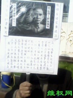 有抗议者高举国民党国父 孙中山 先生的画像,表示对 孙中山 先生的怀念,对 孙中山 先生创建的国民党的敬仰和爱戴。回想当年国民党在大陆执政时,没有发生抢了老百姓的房屋土地还要把人行政拘留、刑事拘留、逮捕、判刑、劳教、关黑监狱、送精神病院等恶劣事件。