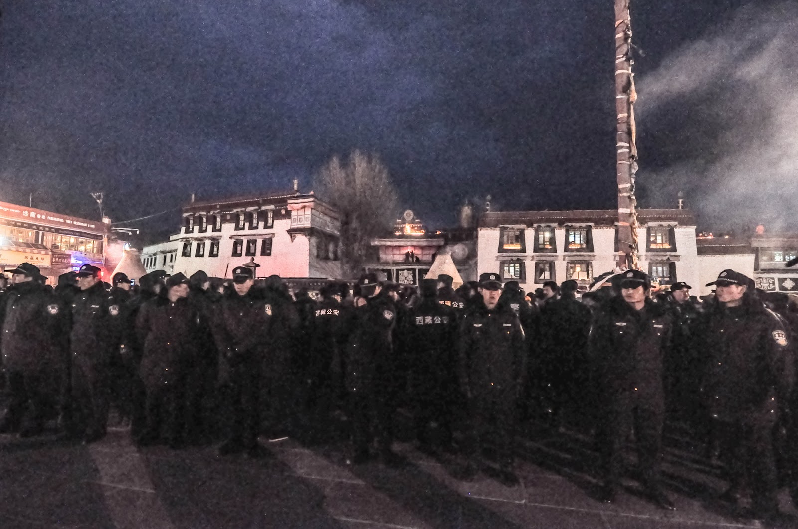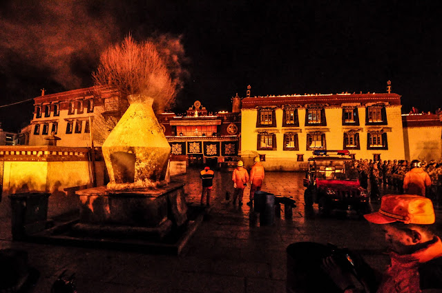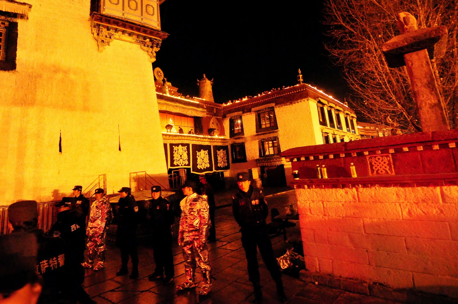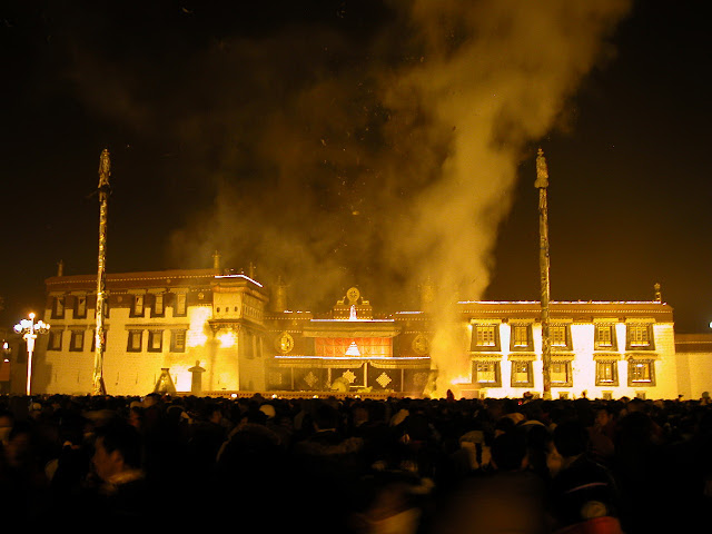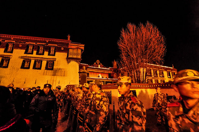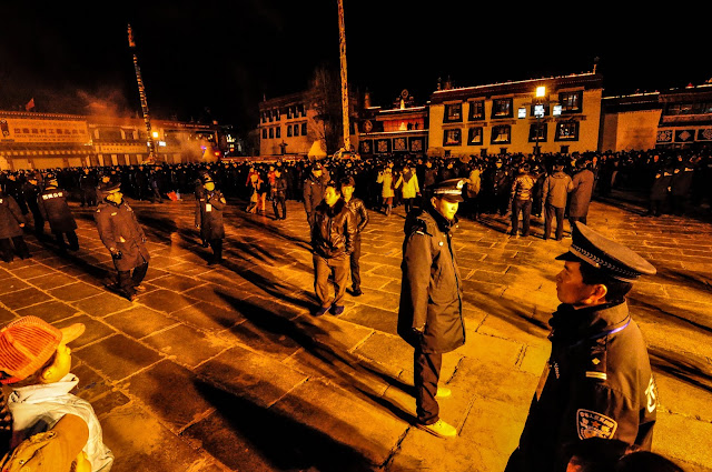“听当地藏人说,今天是2008年3月中之后最紧张的一天。军警也是这几年最夸张的一次。还听说以前燃灯节时在大昭寺跟前的香炉烧得极旺,今年虽然有烟,但不多了。