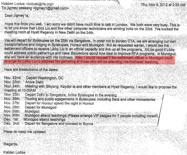 刘仚的左膀右臂嘎登洛卓无意间泄露的一份电子邮件清楚地显示了一个类似这样CTA作为“回报”给刘仚提供的机会,很多图伯特媒体都在前几天收到了这份邮件。刘仚目前在印度访问,而且将在印度南部受到盛大的红地毯接待,她将在芒古德(Mungod)与尊者公开会面,甚至还将有机会向公众发表讲话。这精心设计的一切都是为了给BBG留下她与达赖喇嘛关系是何等密切的印象。嘎登在电子邮件中写道,“我将请求芒古德安置点负责官员为刘仚安排一次机会向参加尊者传法集会的公众发表讲话。”