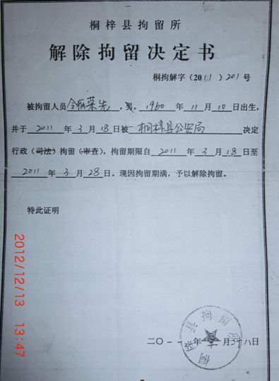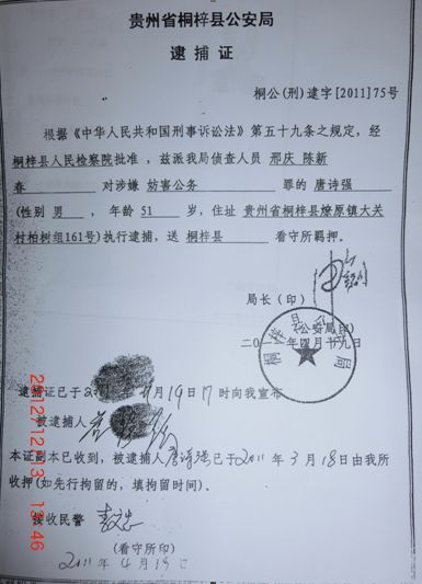 3月18日,桐梓县公安局对令狐荣先行政拘留10天,唐诗强送看守所羁押。镇书记王国燕对唐诗强说:“你把字签了,我就向公安局求情,放你出来。”唐诗强断然拒绝。4月19日,桐梓县公安局以桐公(刑)逮字﹝2011﹞75号,对唐诗强进行逮捕。10月11日,桐梓县法院以妨害公务罪对唐诗强进行审判,因证明无罪的材料太多,无法宣判。随后又进行了两次开庭,仍无法宣判。到了2012年3月16日,法院强行判决唐诗强有期徒刑两年半。3月26日,唐诗强上诉至遵义市中级法院,被驳回维持原判,但未开庭。8月30日,唐诗强再次向中级法院提起再审。直到现在,遵义市中级法院未作任何回复。