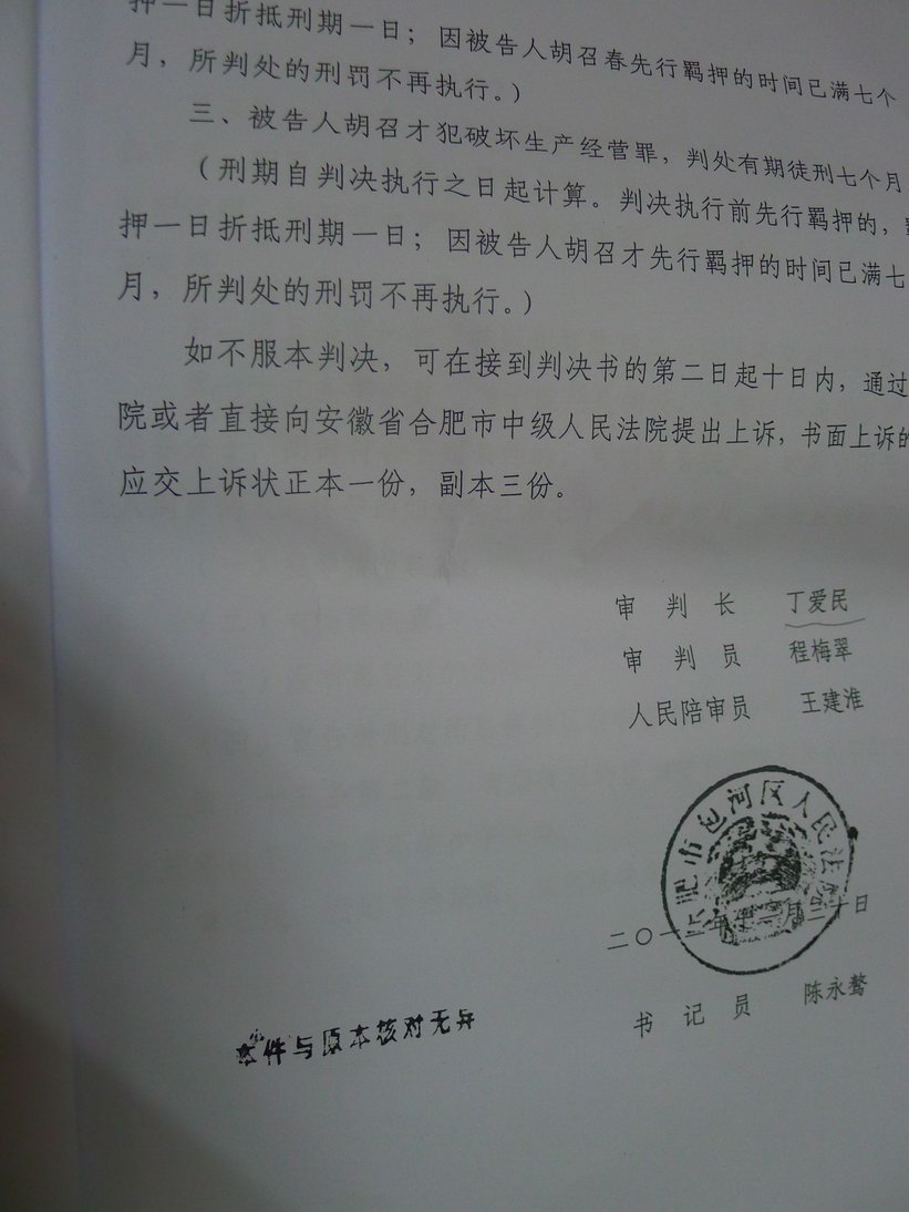 (维权网信息员周维林报道)安徽省合肥市包河区法院于11月30日就胡先正、胡召春和胡召才(三人为父子叔侄关系,下文以胡氏三人称之)作出(2012)包刑初字第00552号《刑事判决书》,并于12月10日送达,判决书分别判处胡先正有期徒刑七个月,缓刑一年,胡召春有期徒刑七个月、胡召才有期徒刑七个月。此前胡召春、胡召才已经被羁押七个月后取保候审,羁押一日折抵刑期一日,因此所判处的刑罚不需要执行,而胡先正则是在羁押五个多月后取保候审,故按此判决尚需执行缓刑;对此判决胡氏三人不服,已经于12月14日下午由胡先正在马粮钢陪同下到法院提起上诉,胡先正委托朋友马粮钢作为其二审的代理人为其辩护。