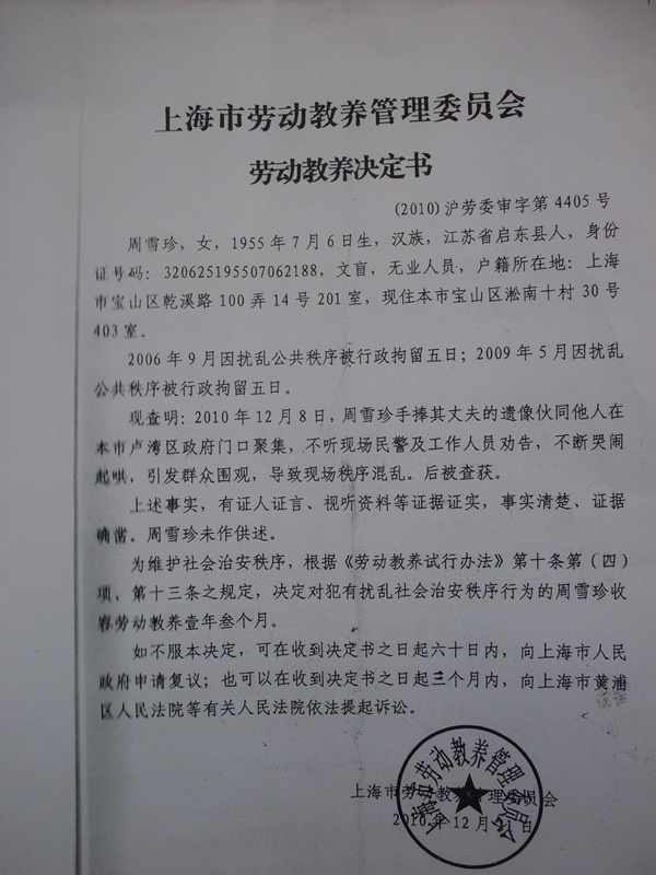2010年12月,55周岁(已经到了退休年龄)超过5个月的周雪珍被上海市劳动教养管理委员会作出(2010)沪劳委审字第4405号《上海市劳动教养管理委员会劳动教养决定书》,对其收容劳动教养1年零3个月。