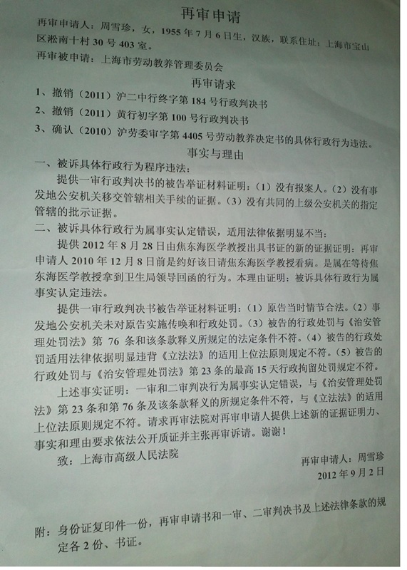 (维权网信息员孙小芸报道)12月17日下午2时,是上海市第二中级法院书面通知周雪珍召开关于劳教一案的听证会的时间。