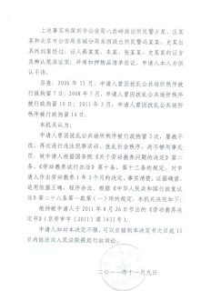 (维权网信息员齐迹报道)北京市东城区上访维权人士刘秀芝,于2011年8月16日到广东省深圳福田区体育中心观看 十米 跳台比赛,因身上携带上访资料被安检人员查出后禁止其入内,随后被带往派出所。北京市东四派出所警察到广东深圳八卦岭派出所将她脸部和腰部打伤,将其押回北京,北京市劳教委依据《关于劳教教养问题的决定》第二条、《劳动教养试行办法》第十条第三项及第十三条的规定,将刘秀芝劳动教养1年零3个月。今年11月15日期满释放。