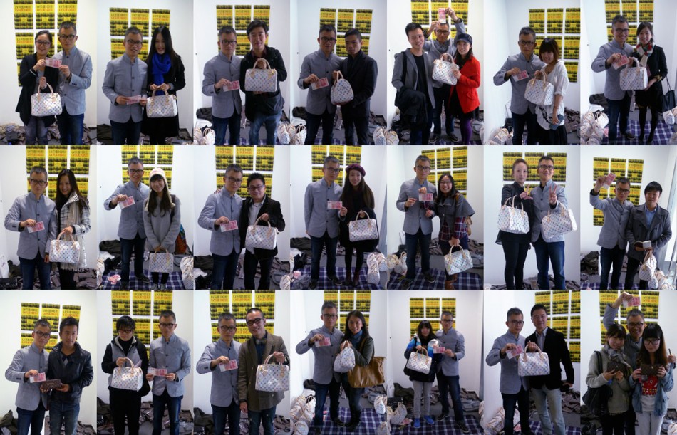 杨烨炘把它命名为《LV只值100元!LV只卖100元!》,他把”LV包”以100元的价格出售给展览现场的观众,在包上签名,并与购买者合照。这个”LV包”之所以被加上了引号,是因为”这些包都是我在淘宝上买的仿品,价格就在100元左右”,而现场参与的购买者也”不是傻子,他们早就知道不是真货”,他们并不是临时起意的过路人,而是杨烨炘为这场行为艺术召集来的一个重要的组成部分。
