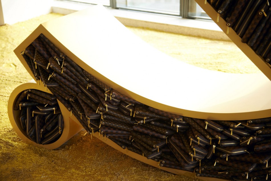 11月17日,行为装置《末法时代2》亮相上海SOHO世纪广场,在铺满金粉的展厅里,近600个LV包被堆砌成巨大的镰刀和锤头。这是杨烨炘行为装置”末法时代”系列的第二件作品,树立在由Welovead网站主办的上海第二届广告人艺术节的展览现场。他这样诠释这件作品的内涵:”今日中国,是世界第一的拜金主义国家,信仰迷茫,精神迷失。曾经神圣的理想,被确认的价值观,在金钱腐蚀下,仅剩个退色的标签。”