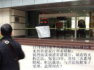 福建省住房和城乡建设厅的工作人员在大楼里面坚守不出,让一些自称是该厅法律部门的小喽罗们与80岁的癌症老人林贞廉打疲劳战,并在推推搡搡中将老人推倒在地而爬不起来。