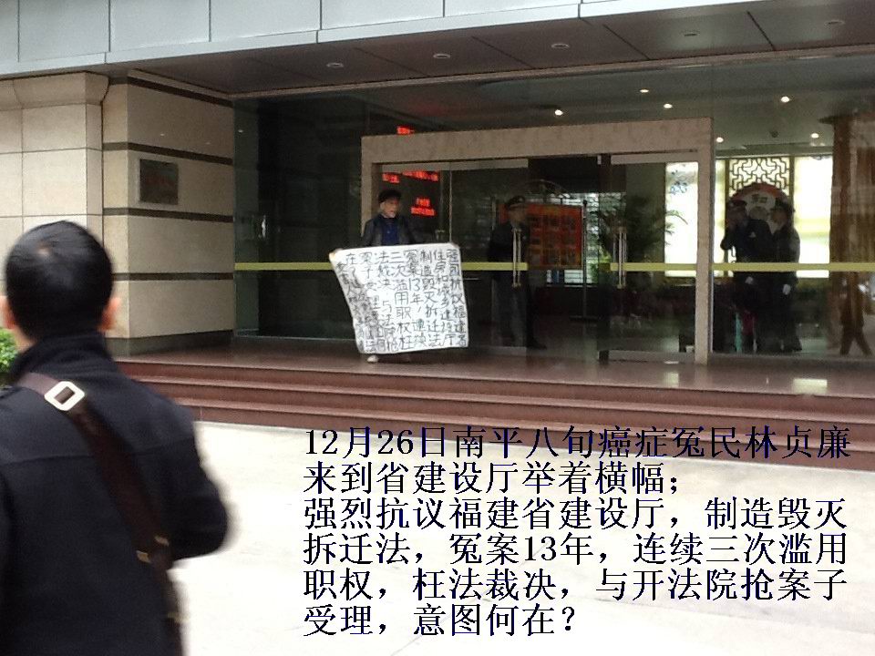 在了解到南平市政府已经拒绝星光造纸集团公司提起的行政复议的情况后,癌症老人林贞廉于今天早晨乘坐3个多小时的火车,赶到福建省住房和城乡建设厅,质问该厅的老爷们:究竟有多少油水让他们不顾法律程序,非法受理党产星光造纸集团公司的行政复议?