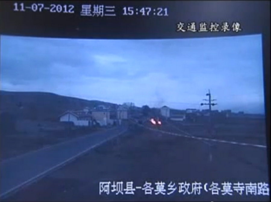 我不想看CCTV的谎话连篇,但要分析和研究党国是如何开动宣传机器,用其宣传攻势去扭曲藏人自焚真相,就只得看下去,而且不止一遍。另一个看的原因,是片子中披露了自焚藏人的照片和自焚时被摄像头拍到的场景——虽然极少,但非常珍贵,令人心碎的珍贵。其中一个场景是,三个藏人在偏僻的乡村道路上,在乡政府前,点燃了自己。当局的监控摄像头远远地拍下了三簇燃烧的、倏忽即灭的火苗。