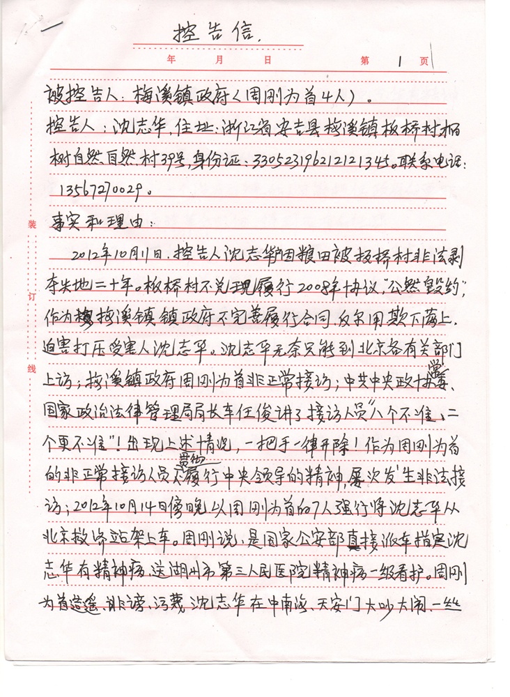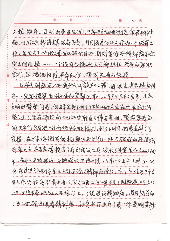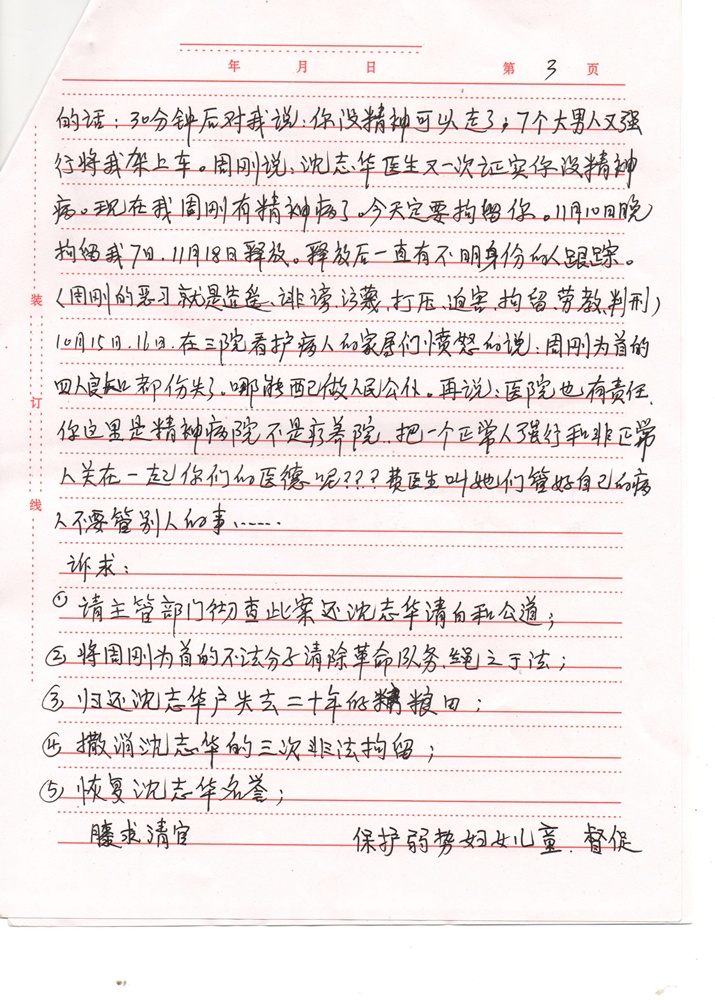 令沈志华不能容忍的是,安吉县梅溪镇“综合治理办公室”(简称综治办)主任周刚在将其两次送精神医院时,还对沈志华进行了造谣、诽谤、虐待等人身污辱和人身迫害。这位自称是浙江省公安厅副厅长侄子的镇综治办主任,伪造“圣旨”,说将沈志华关精神病医院是公安部的指示,因为沈志华在天安门“一丝不挂地裸奔”。当沈志华到北京去核实、追查周刚的造谣诬蔑行为时,周刚又一次带人将沈志华从北京抓回送精神病医院。